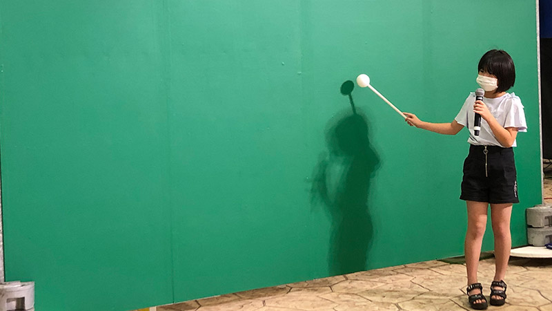 気象予報士のお仕事として、気象予報士からお天気について勉強したあと、テレビ番組のお天気情報のように天気図をバックにお伝えする体験ができます。