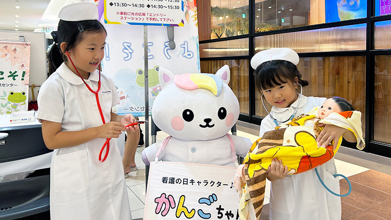 看護師のお仕事として①白衣着用し、写真撮影②赤ちゃんのお世話③聴診器による心臓の音や呼吸音などきく。