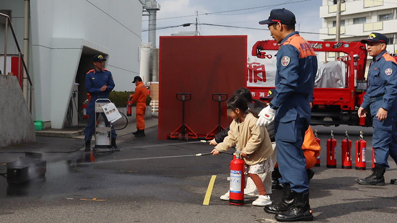 消防士のお仕事として、防火衣着装体験、消火体験及び煙体験などのお仕事体験ができます。