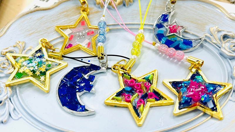 キレイな海を守る大切さを伝えるお仕事として、海洋ごみや日常では使われなくなったキレイなプラスチックを使って星や月のカタチのレジンキーホルダーを作り、海洋プラスチック問題について理解を深めます。