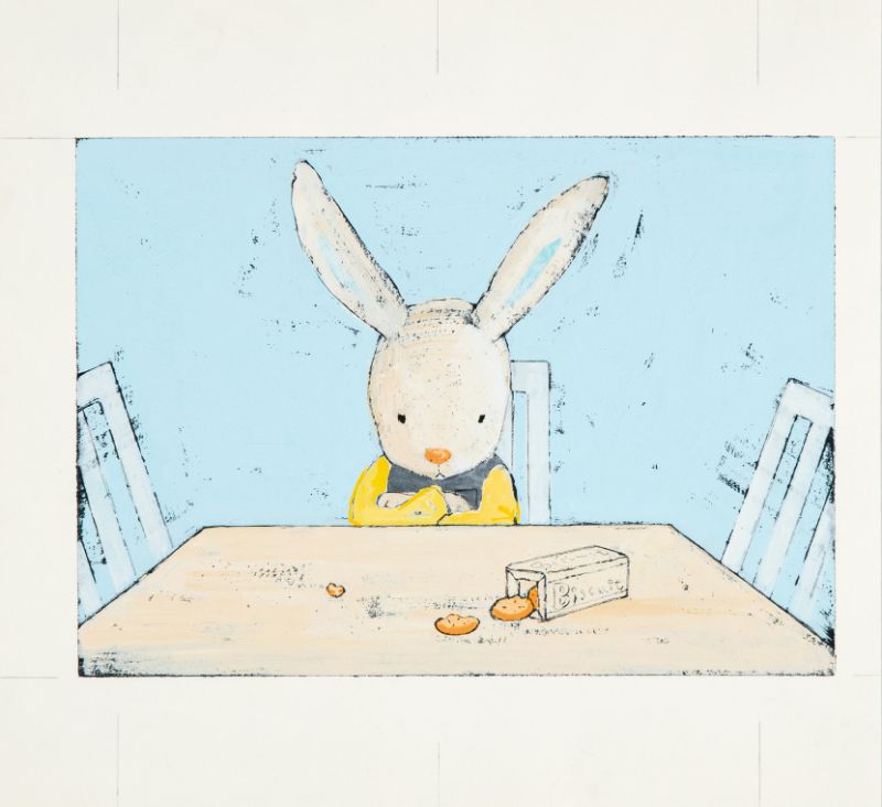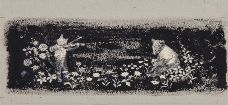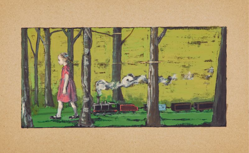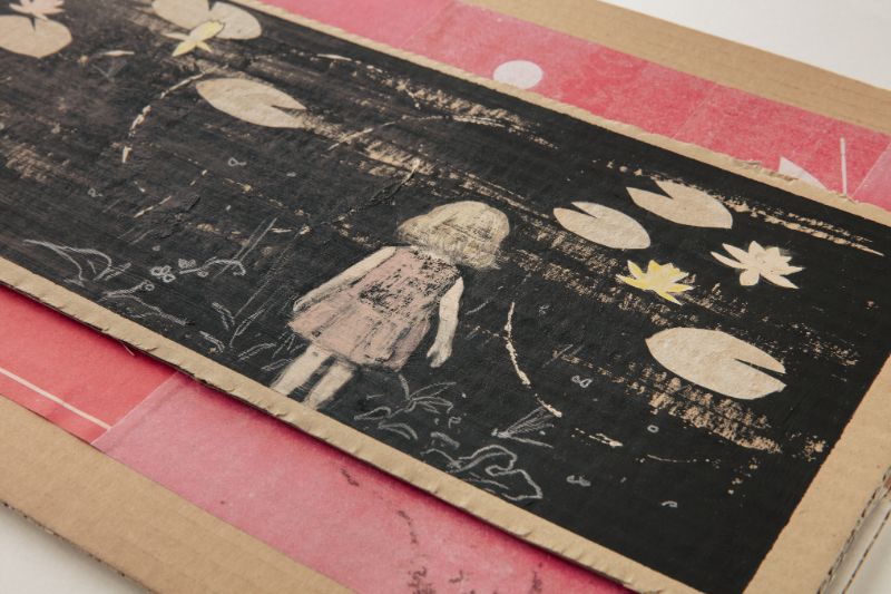 デビュー作から最新作まで20冊を超す絵本から、約250点の原画を選びました。原画は、画用紙や段ボールなどを黒い絵の具で下塗りした上に色が配され、子どもや動物たちがひそやかに描かれています。