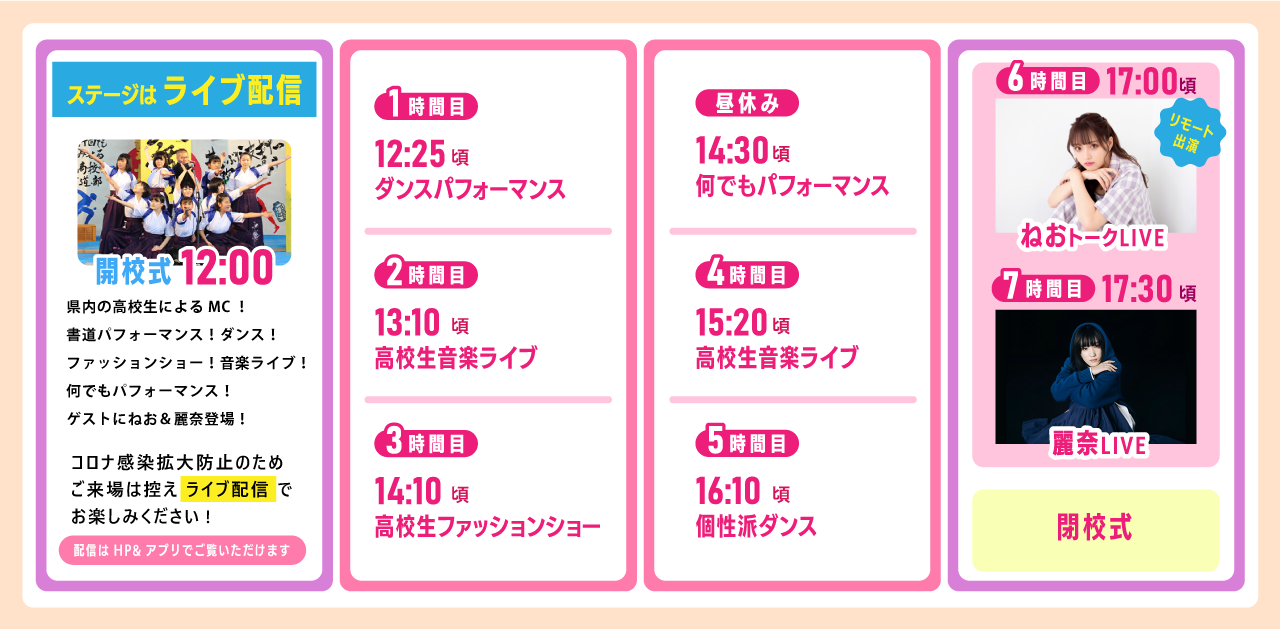 各学校ならではのあるある話や部活動紹介、学校の名物先生の登場にお悩み相談etc...様々なコーナーで番組を盛り上げていきます。