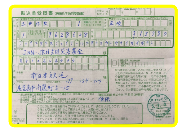 お寄せ頂きました募金「13,780円」につきましては、事務局の方で責任を持って募金口座へ振込致しました。