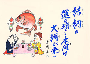 結納の運を願ごて床間け大鯛が乗っ