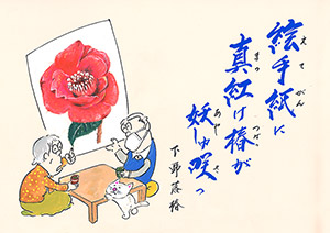 絵手紙に真紅け椿が妖しゅ咲っ
