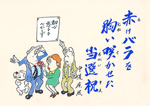 赤けバラを 胸い咲かせた 当選祝
