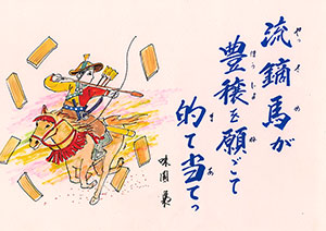 流鏑馬が 豊穣を願ごて 的て当てっ |