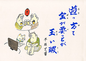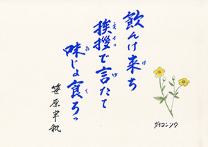 飲んけ来ち 挨拶で言たて 味じょ食ろっ |