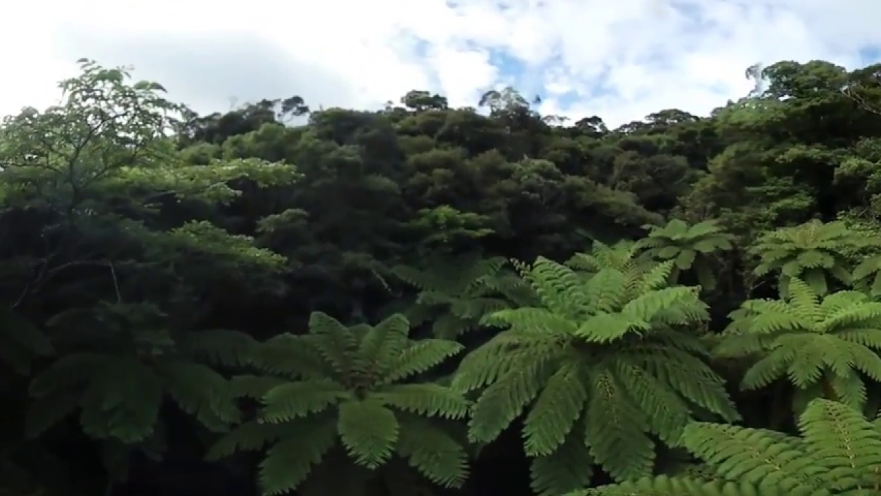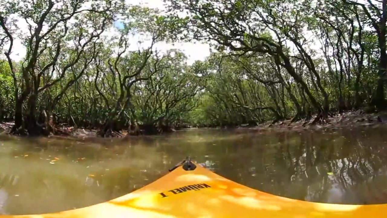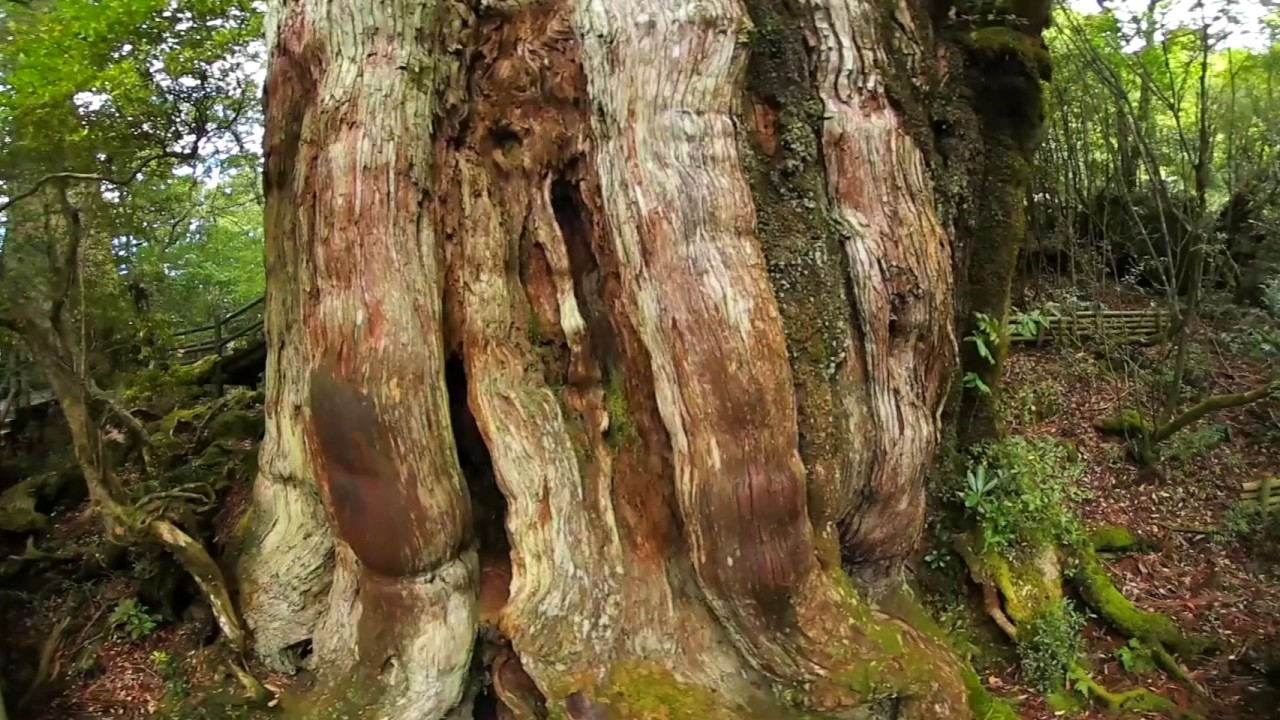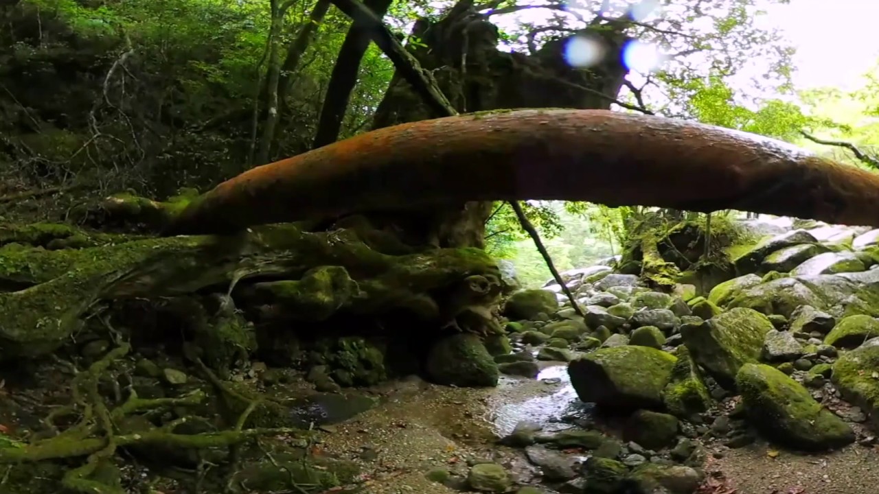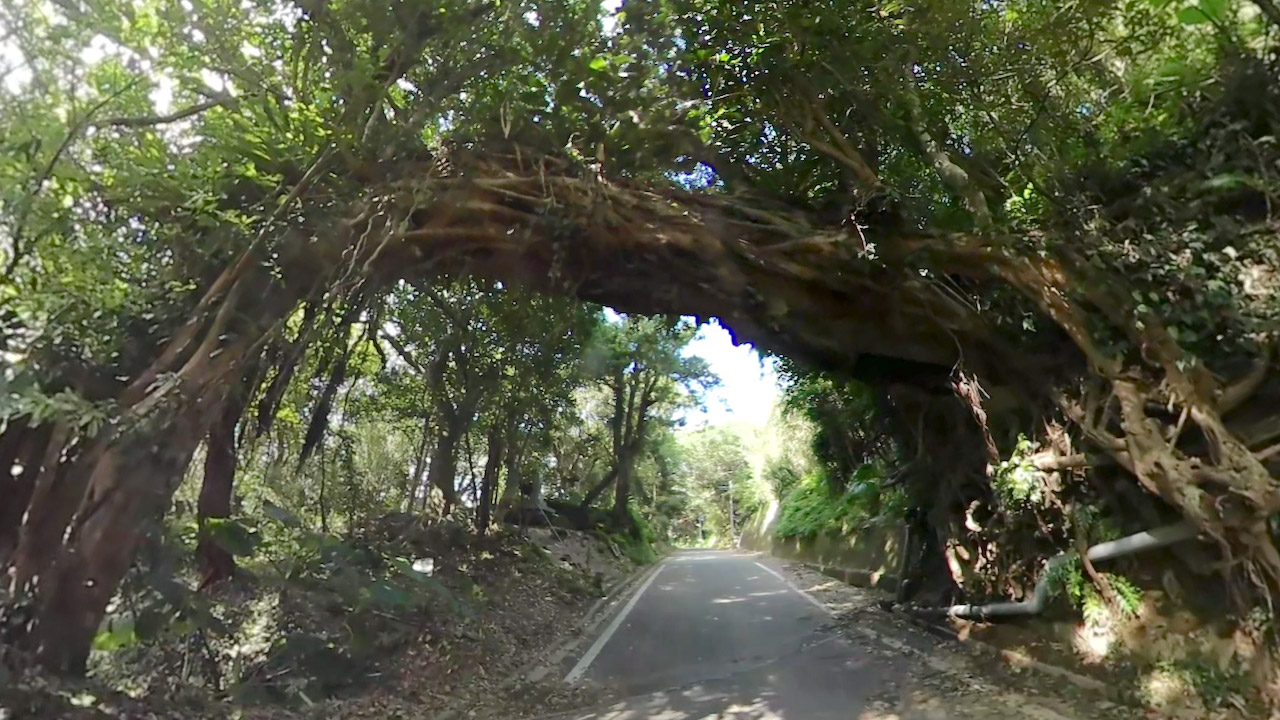 台風で倒れたアコウの巨木が横たわり生きた木のトンネルに。