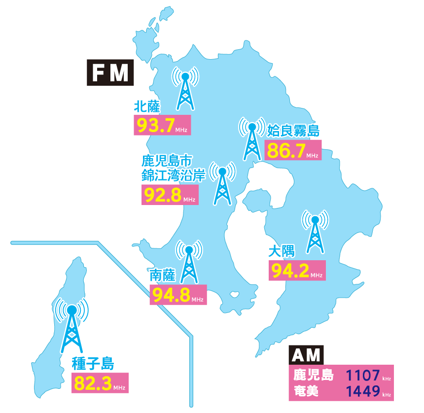 - AMと全く同じ放送をFMで放送しています。北薩エリアは93.7MHzで送信しています。