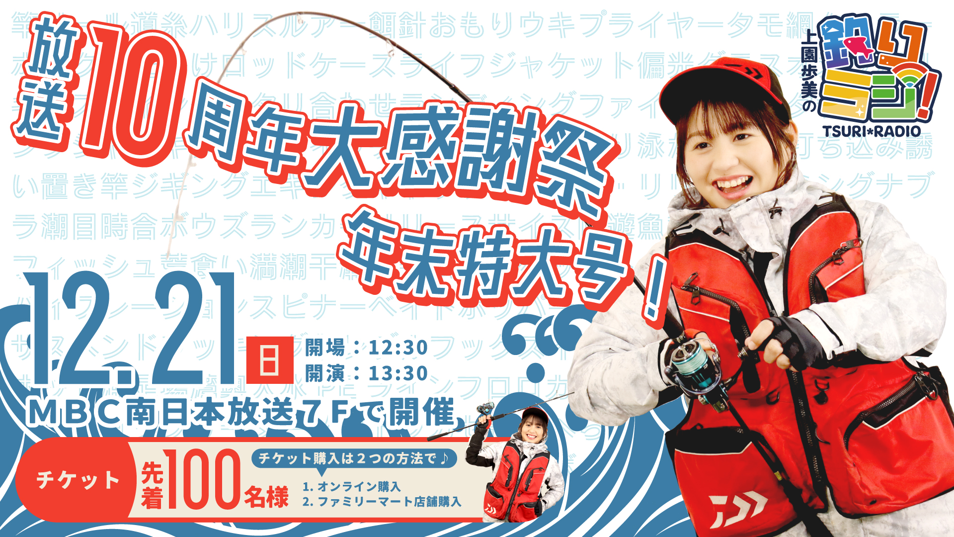 MBCの釣りガール上園歩美が鹿児島からお届けしている釣り番組『上園歩美の釣りラジ!』が放送10周年を迎えました!これを記念して、釣り人のためのプレミアイベント第3弾を開催!その名も「上園歩美の釣りラジ!放送10周年大感謝祭!~年末特大号!~」!!