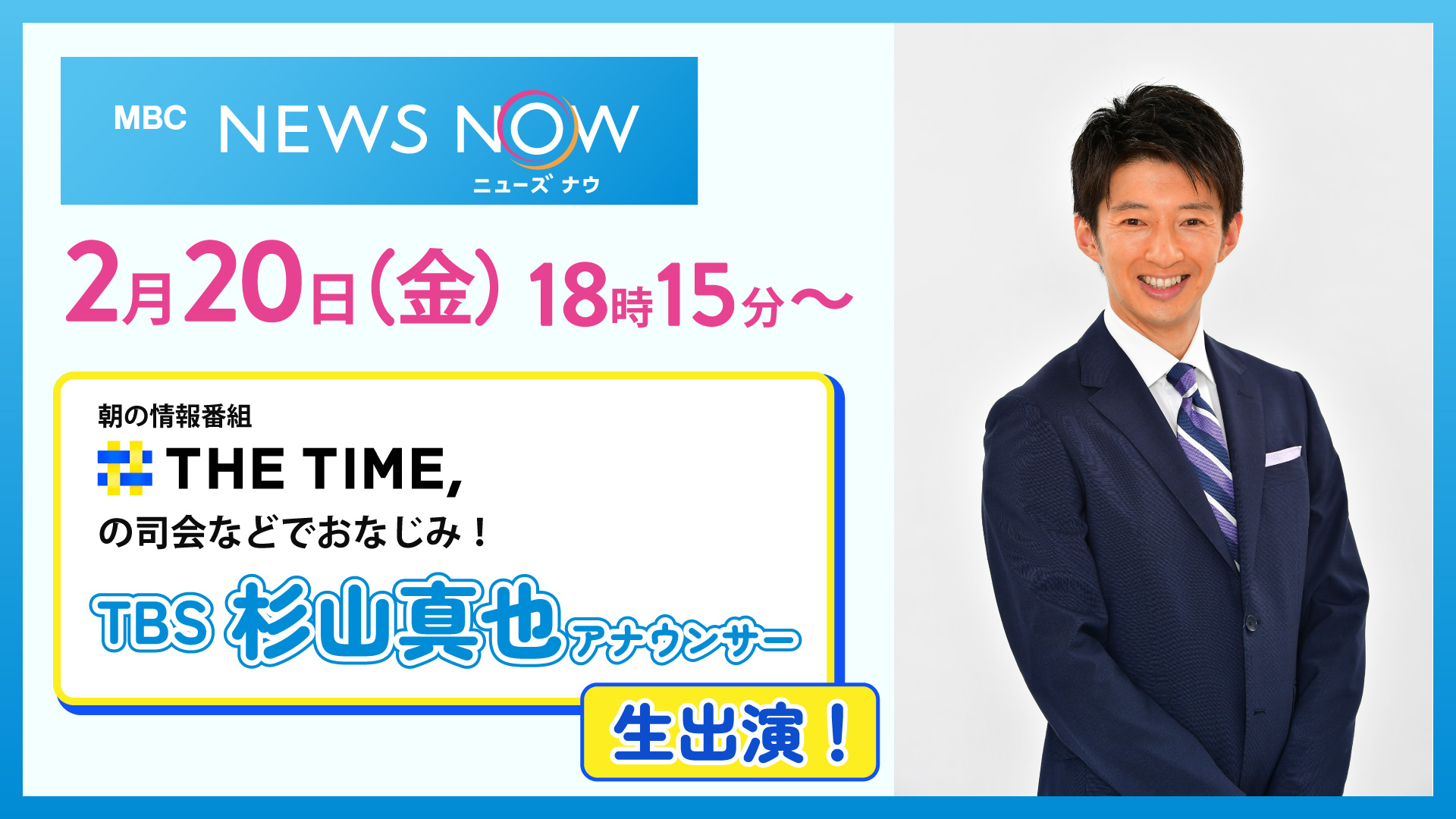「MBCニューズナウ」に朝の情報番組「THE TIME,」の司会や「SASUKE」の実況などでおなじみのTBS杉山真也アナウンサーが生出演します。